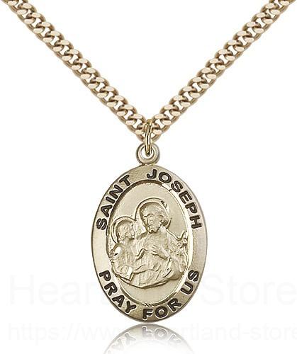 This St. Joseph Medal is paired with a 24 inch stainless steel gold-tone heavy curb chain as pictured. All medals are gift boxed in a light blue velvet jewelry box ready for gift giving.