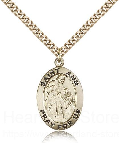 This St. Ann Medal is paired with a 24 inch stainless steel gold-tone heavy curb chain as pictured. All medals are gift boxed in a light blue velvet jewelry box ready for gift giving.