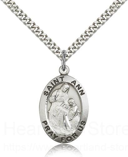 This St. Ann Medal is paired with a 24 inch stainless steel heavy curb chain as pictured. All medals are gift boxed in a light blue velvet jewelry box ready for gift giving.