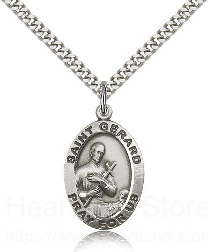 This St. Gerard Medal is paired with a 24 inch stainless steel heavy curb chain as pictured. All medals are gift boxed in a light blue velvet jewelry box ready for gift giving.