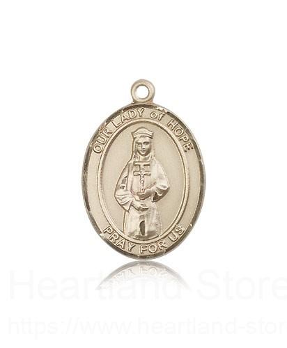 This Our Lady of Hope Pendant is made of 14 Karat Gold and is approximately the size of a quarter. The jewelry pendant is sold individually and does not come with a chain. All medals are gift boxed in a beautiful blue velvet hinged jewelry gift box.