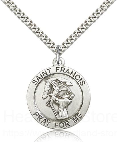 This St. Francis Medal is paired with a 24 inch stainless steel heavy curb chain as pictured. All medals are gift boxed in a light blue velvet jewelry box ready for gift giving.