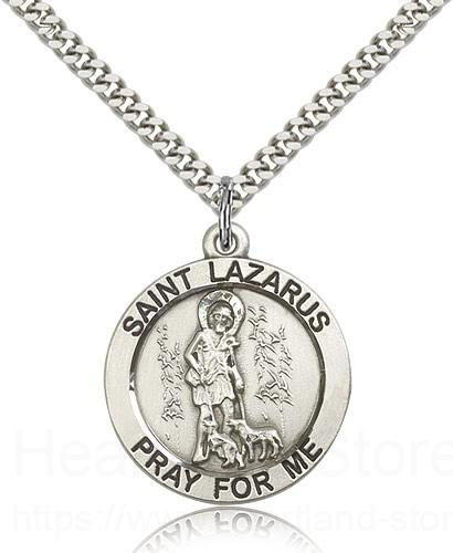 This St. Lazarus Medal is paired with a 24 inch stainless steel heavy curb chain as pictured. All medals are gift boxed in a light blue velvet jewelry box ready for gift giving.