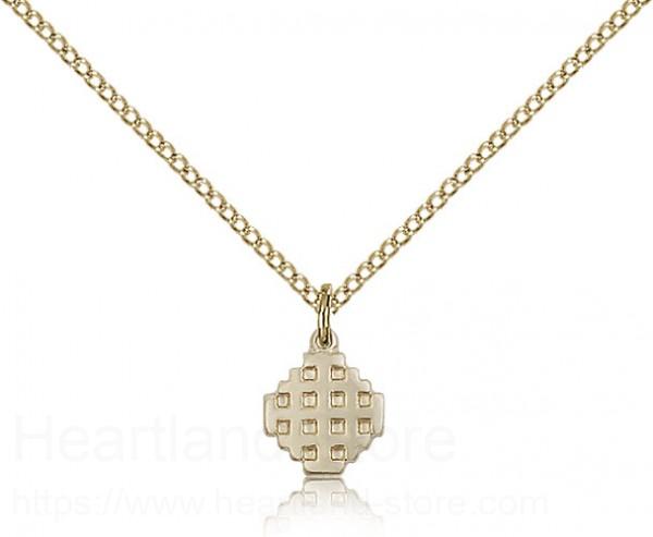 This Jerusalem Cross Pendant is paired with an 18" gold filled light curb chain as pictured. All medals are gift boxed in a light blue velvet gift box ready for gift giving.