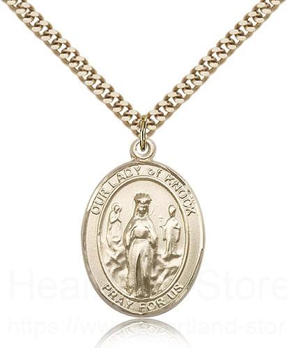 This Our Lady of Knock Pendant is made of gold filled and is approximately the size of a quarter. The jewelry pendant is paired with a 24 inch gold filled heavy curb chain as pictured. All medals are gift boxed in a beautiful blue velvet hinged jewelry gift box.