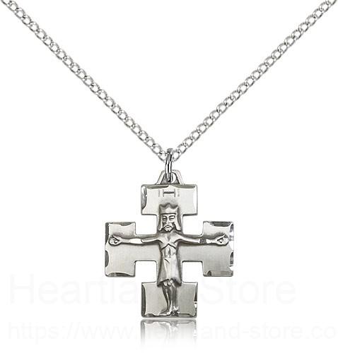 This Modern Crucifix Pendant is paired with an 18 inch sterling silver lite curb chain as pictured. All medals are gift boxed in a light blue velvet jewelry box ready for gift giving.