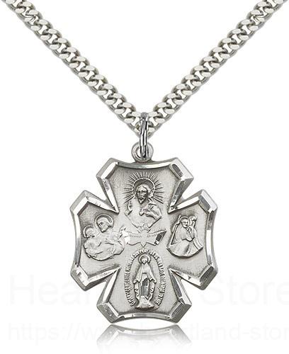 This 4 Way Cross Pendant is paired with a 24 inch stainless steel heavy curb chain as pictured. All medals are gift boxed in a light blue velvet jewelry box ready for gift giving.