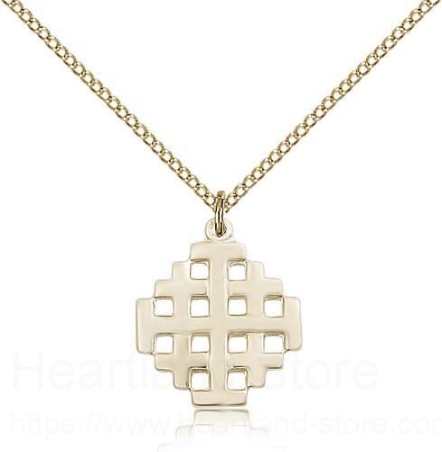 This Jerusalem Cross Pendant is paired with an 18" gold filled light curb chain as pictured. All medals are gift boxed in a light blue velvet gift box ready for gift giving.