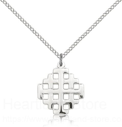 This Jerusalem Cross Pendant is paired with an 18 inch sterling silver lite curb chain as pictured. All medals are gift boxed in a light blue velvet jewelry box ready for gift giving.