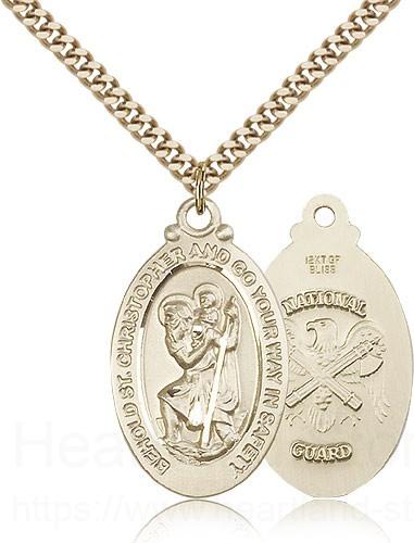This St. Christopher National Guard Medal is paired with a 24 inch stainless steel gold-tone heavy curb chain as pictured. All medals are gift boxed in a light blue velvet jewelry box ready for gift giving.