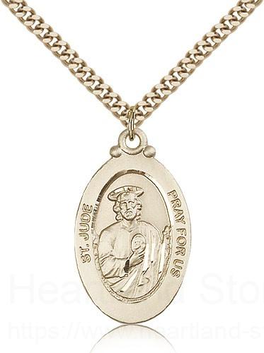 This St. Jude Medal is paired with a 24 inch stainless steel gold-tone heavy curb chain as pictured. All medals are gift boxed in a light blue velvet jewelry box ready for gift giving.