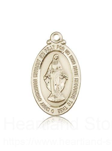 This Miraculous Medal is made of 14 Karat Gold. The jewelry pendant is sold as pictured and does not come with a chain. All medals are gift boxed in a light blue velvet jewelry box ready for gift giving.