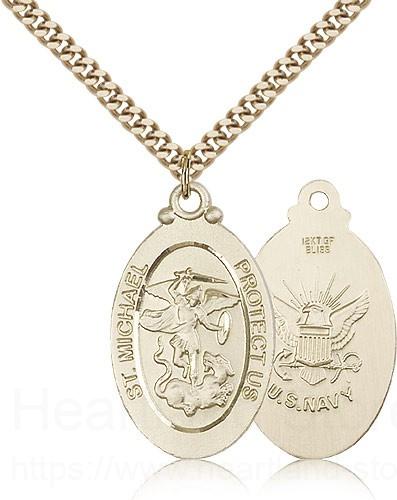 This St. Michael Navy Medal is paired with a 24 inch stainless steel gold-tone heavy curb chain as pictured. All medals are gift boxed in a light blue velvet jewelry box ready for gift giving.