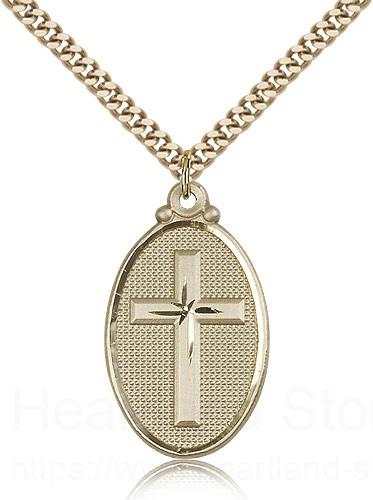 This Cross Pendant is paired with a 24 inch stainless steel gold-tone heavy curb chain as pictured. All medals are gift boxed in a light blue velvet jewelry box ready for gift giving.