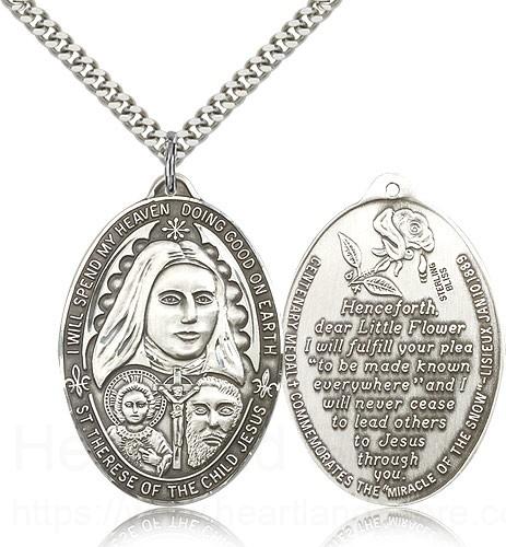 This St. Therese Medal is paired with a 24 inch stainless steel heavy curb chain as pictured. All medals are gift boxed in a light blue velvet jewelry box ready for gift giving.