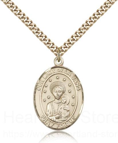 This Our Lady of La Vang Pendant is made of gold filled and is approximately the size of a quarter. The jewelry pendant is paired with a 24 inch gold filled heavy curb chain as pictured. All medals are gift boxed in a beautiful blue velvet hinged jewelry gift box.