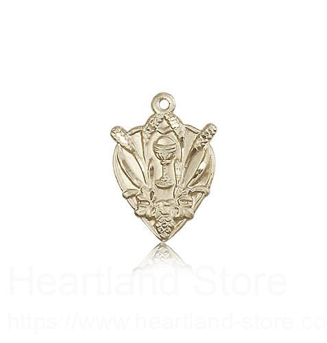 This Communion Medal is made of 14 Karat Gold. The jewelry pendant is sold as pictured and does not come with a chain. All medals are gift boxed in a light blue velvet jewelry box ready for gift giving.
