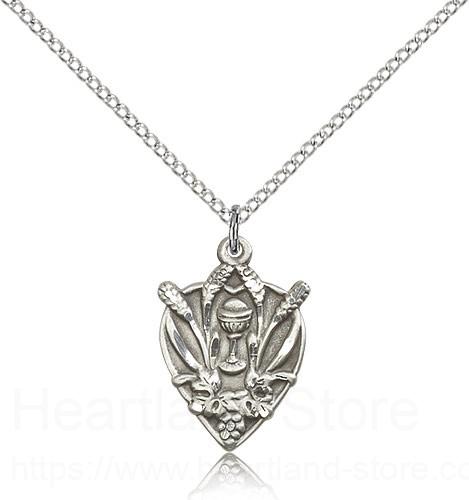 This Communion Medal is paired with an 18 inch sterling silver lite curb chain as pictured. All medals are gift boxed in a light blue velvet jewelry box ready for gift giving.