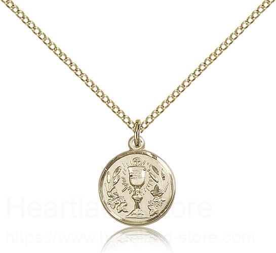 This Communion Chalice Medal is paired with an 18" gold filled light curb chain as pictured. All medals are gift boxed in a light blue velvet gift box ready for gift giving.