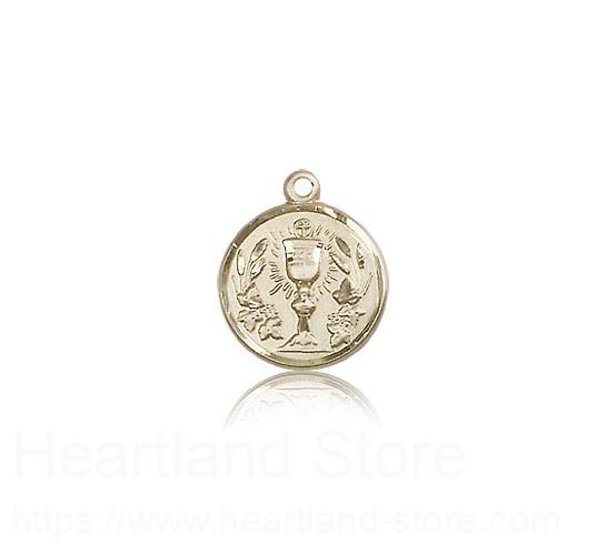 This Communion Chalice Medal is made of 14 Karat Gold. The jewelry pendant is sold as pictured and does not come with a chain. All medals are gift boxed in a light blue velvet jewelry box ready for gift giving.