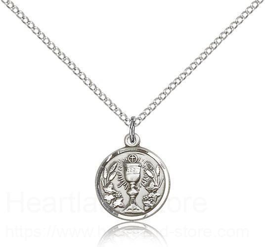 This Communion Chalice Medal is paired with an 18 inch sterling silver lite curb chain as pictured. All medals are gift boxed in a light blue velvet jewelry box ready for gift giving.