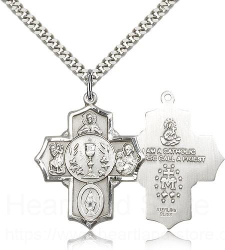 This 5 Way Cross Pendant is paired with a 24 inch stainless steel heavy curb chain as pictured. All medals are gift boxed in a light blue velvet jewelry box ready for gift giving.