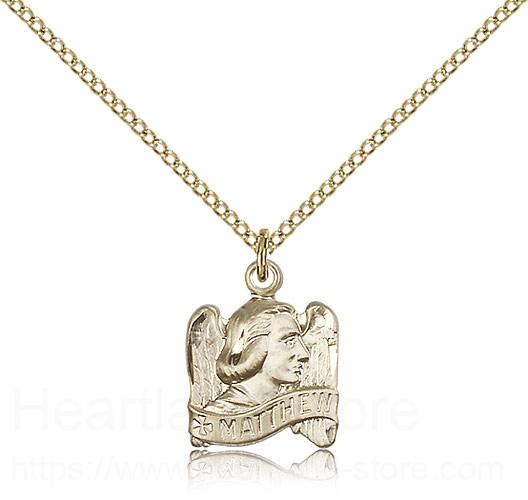 This St. Matthew Medal is paired with an 18" gold filled light curb chain as pictured. All medals are gift boxed in a light blue velvet gift box ready for gift giving.