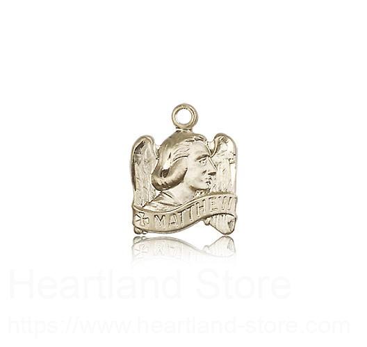 This St. Matthew Medal is made of 14 Karat Gold. The jewelry pendant is sold as pictured and does not come with a chain. All medals are gift boxed in a light blue velvet jewelry box ready for gift giving.