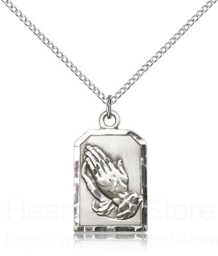 This Praying Hands Pendant is paired with an 18 inch sterling silver lite curb chain as pictured. All medals are gift boxed in a light blue velvet jewelry box ready for gift giving.
