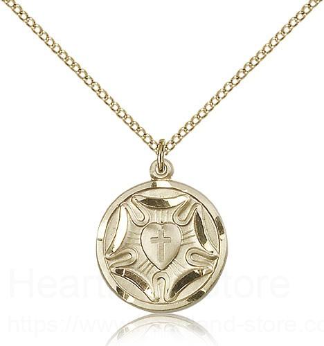 This Lutheran Medal is paired with an 18" gold filled light curb chain as pictured. All medals are gift boxed in a light blue velvet gift box ready for gift giving.