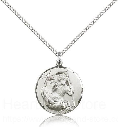 This Holy Family Medal is paired with an 18 inch sterling silver lite curb chain as pictured. All medals are gift boxed in a light blue velvet jewelry box ready for gift giving.