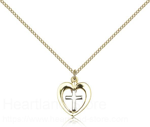 This Heart Cross Pendant is paired with an 18" gold filled light curb chain as pictured. All medals are gift boxed in a light blue velvet gift box ready for gift giving.