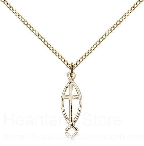 This Fish Cross Pendant is paired with an 18" gold filled light curb chain as pictured. All medals are gift boxed in a light blue velvet gift box ready for gift giving.