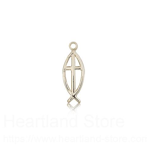 This Fish Cross Pendant is made of 14 Karat Gold. The jewelry pendant is sold as pictured and does not come with a chain. All medals are gift boxed in a light blue velvet jewelry box ready for gift giving.