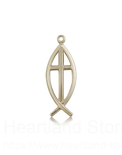 This Fish Cross Pendant is made of 14 Karat Gold. The jewelry pendant is sold as pictured and does not come with a chain. All medals are gift boxed in a light blue velvet jewelry box ready for gift giving.