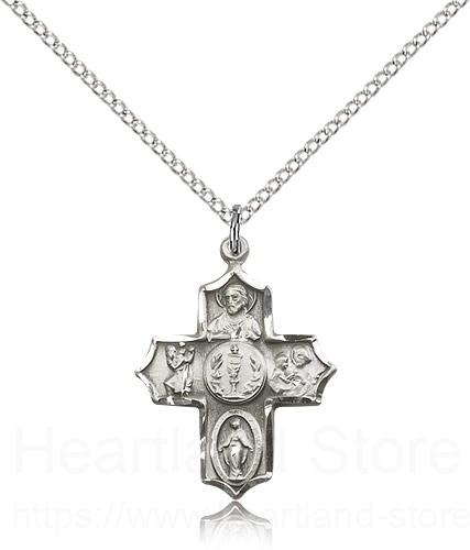 This 4 Way Cross Pendant is paired with an 18 inch sterling silver lite curb chain as pictured. All medals are gift boxed in a light blue velvet jewelry box ready for gift giving.