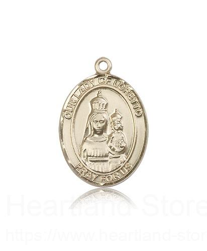 This Our Lady of Loretto Pendant is made of 14 Karat Gold and is approximately the size of a quarter. The jewelry pendant is sold individually and does not come with a chain. All medals are gift boxed in a beautiful blue velvet hinged jewelry gift box.
