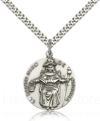 This St. Niño De Atocha Medal is paired with a 24 inch stainless steel heavy curb chain as pictured. All medals are gift boxed in a light blue velvet jewelry box ready for gift giving.