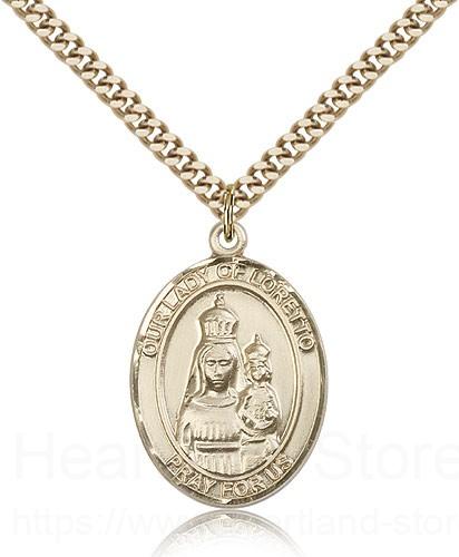 This Our Lady of Loretto Pendant is made of gold filled and is approximately the size of a quarter. The jewelry pendant is paired with a 24 inch gold filled heavy curb chain as pictured. All medals are gift boxed in a beautiful blue velvet hinged jewelry gift box.