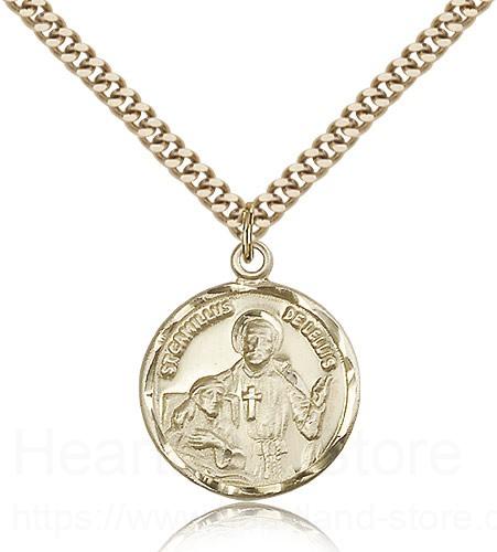 This St. Camillus of Lellis Medal is paired with a 24 inch stainless steel gold-tone heavy curb chain as pictured. All medals are gift boxed in a light blue velvet jewelry box ready for gift giving.