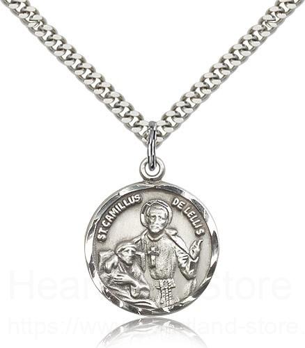 This St. Camillus of Lellis Medal is paired with a 24 inch stainless steel heavy curb chain as pictured. All medals are gift boxed in a light blue velvet jewelry box ready for gift giving.