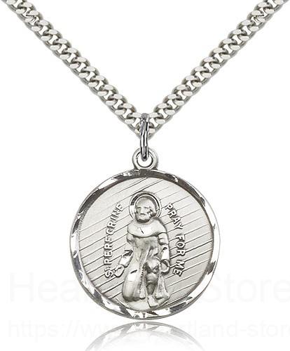 This St. Perregrine Medal is paired with a 24 inch stainless steel heavy curb chain as pictured. All medals are gift boxed in a light blue velvet jewelry box ready for gift giving.