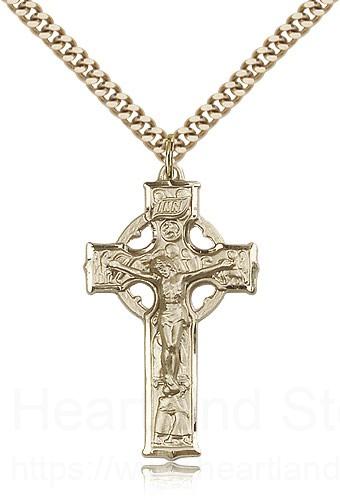This Celtic Crucifix Pendant is paired with a 24 inch stainless steel gold-tone heavy curb chain as pictured. All medals are gift boxed in a light blue velvet jewelry box ready for gift giving.