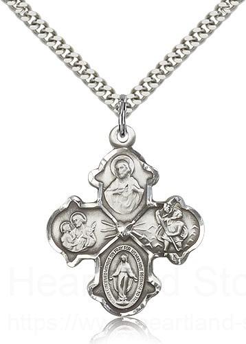 This 4 Way Cross Pendant is paired with a 24 inch stainless steel heavy curb chain as pictured. All medals are gift boxed in a light blue velvet jewelry box ready for gift giving.