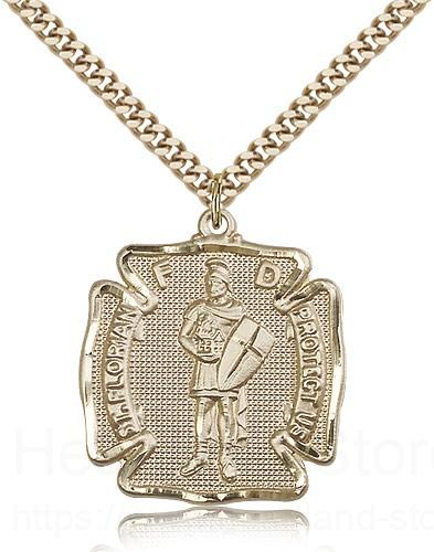 This St. Florian Medal is paired with a 24 inch stainless steel gold-tone heavy curb chain as pictured. All medals are gift boxed in a light blue velvet jewelry box ready for gift giving.
