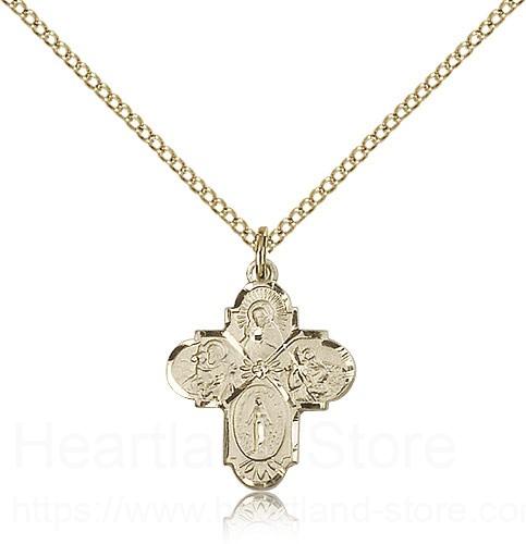 4 Way Cross Pendant is paired with an 18" gold filled light curb chain as pictured. All medals are gift boxed in a light blue velvet gift box ready for gift giving.