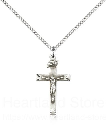 This Crucifix Pendant is paired with an 18 inch sterling silver lite curb chain as pictured. All medals are gift boxed in a light blue velvet jewelry box ready for gift giving.