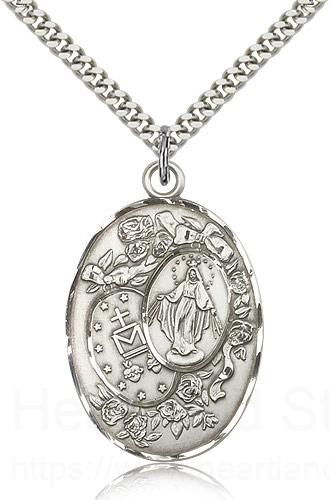This Miraculous Medal is paired with a 24 inch stainless steel heavy curb chain as pictured. All medals are gift boxed in a light blue velvet jewelry box ready for gift giving.
