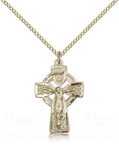 This Celtic Crucifix Pendant is paired with an 18" gold filled light curb chain as pictured. All medals are gift boxed in a light blue velvet gift box ready for gift giving.
