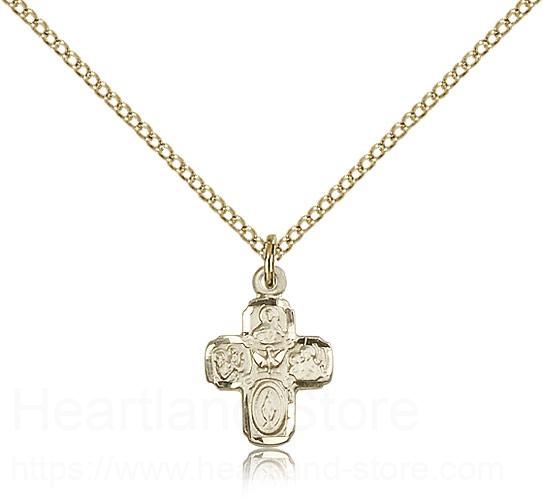 This 4 Way Cross Pendant is paired with an 18" gold filled light curb chain as pictured. All medals are gift boxed in a light blue velvet gift box ready for gift giving.